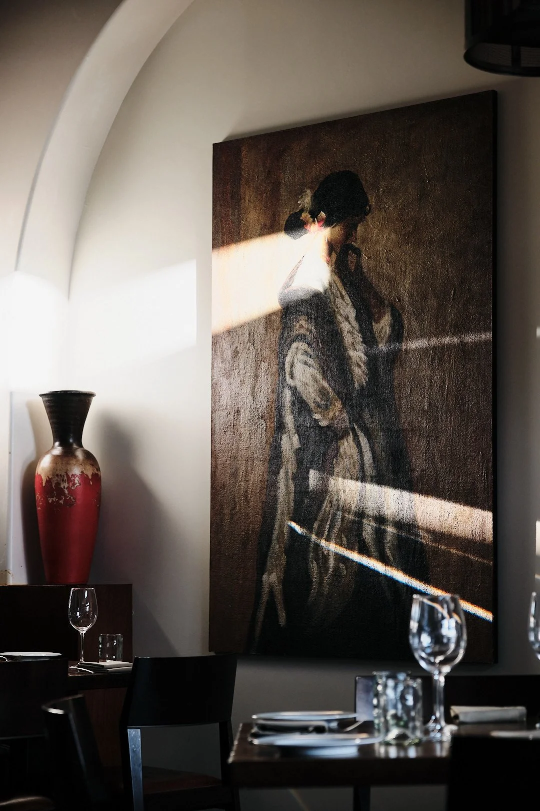 Interior of a restaurant with a large textured painting of a woman with dark hair, standing with her hand near her face, illuminated by a beam of sunlight. There are wine glasses and a tall red vase with beige accents on a side table.