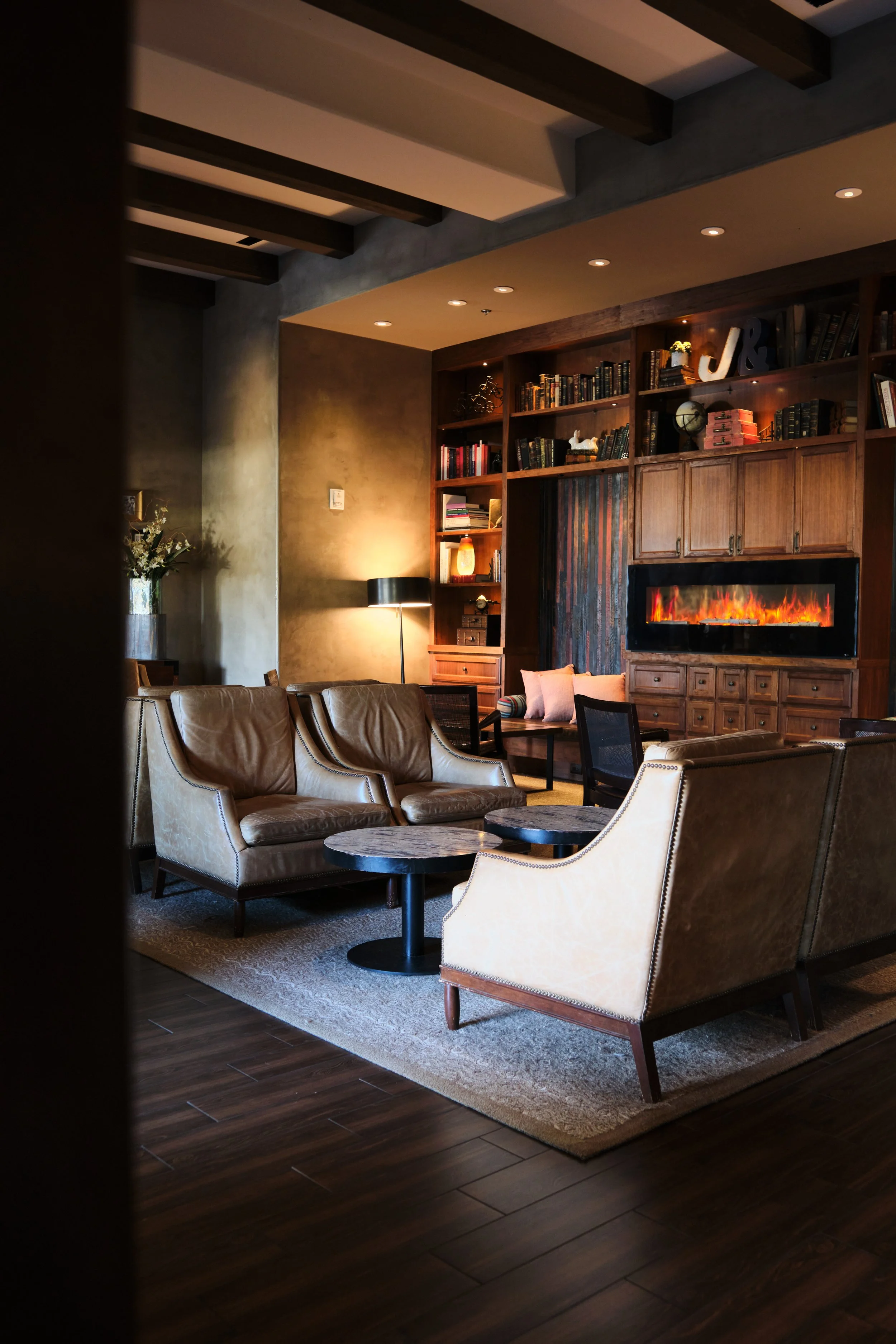 Modern living room with wood ceiling beams, built-in wooden bookshelf, multiple chairs, beige leather armchairs, a beige rug, and a wall-mounted electric fireplace.
