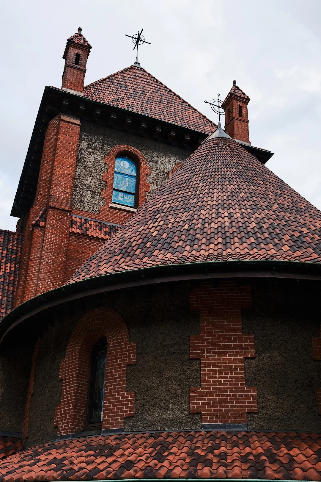 A close-up view of a brick church with a tiled conical roof, arched windows, and metal weather vanes on top of the tower and roof.