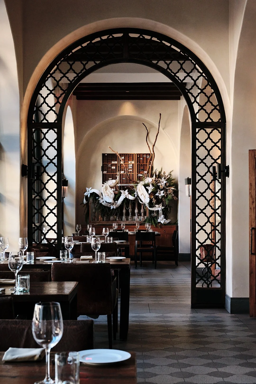 Interior of a stylish restaurant with arched windows, dark wood tables set with glassware and plates, and decorative black metal archways.