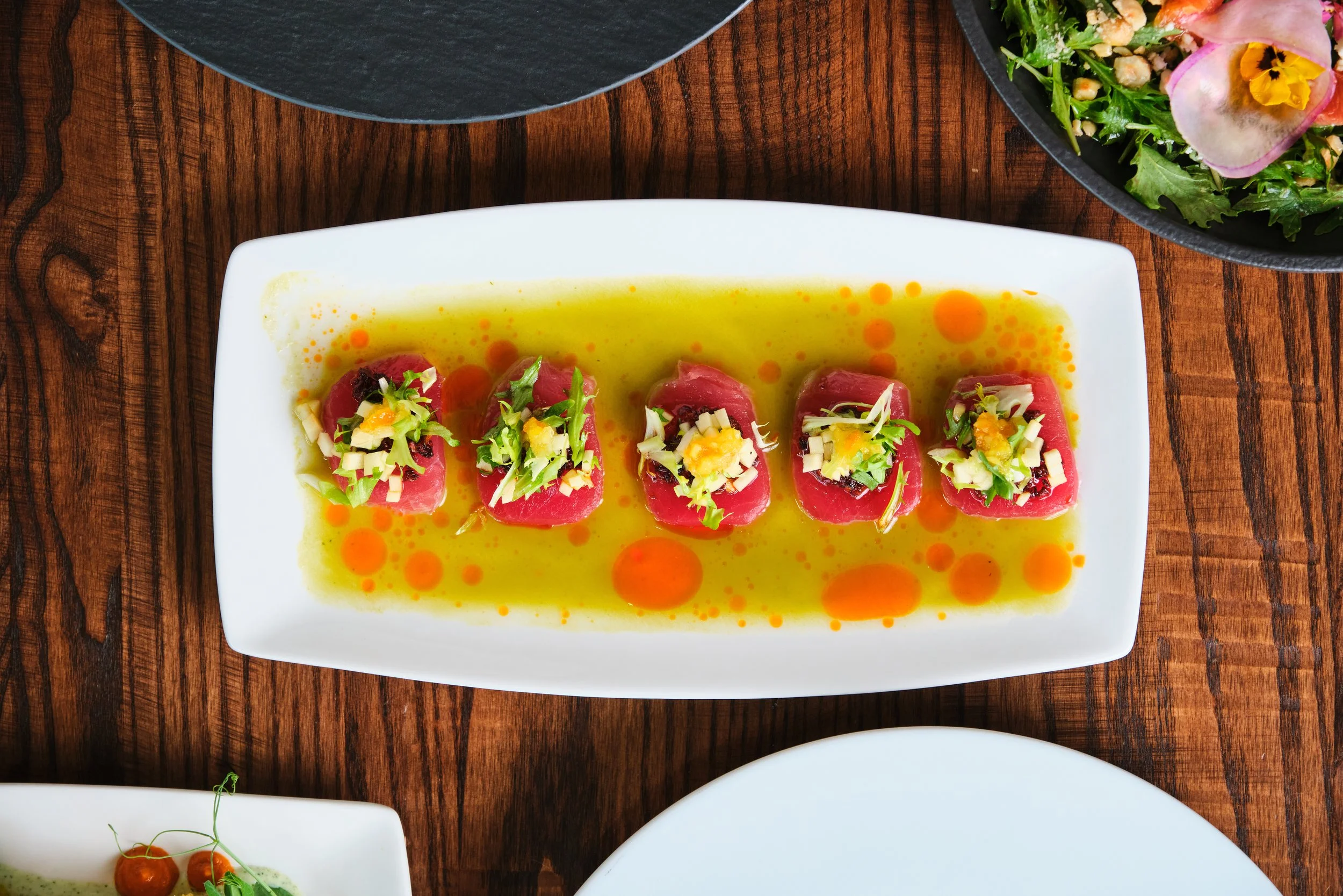 Sliced tuna carpaccio topped with diced vegetables and herbs, drizzled with yellow and orange sauces, arranged on a white rectangular plate.