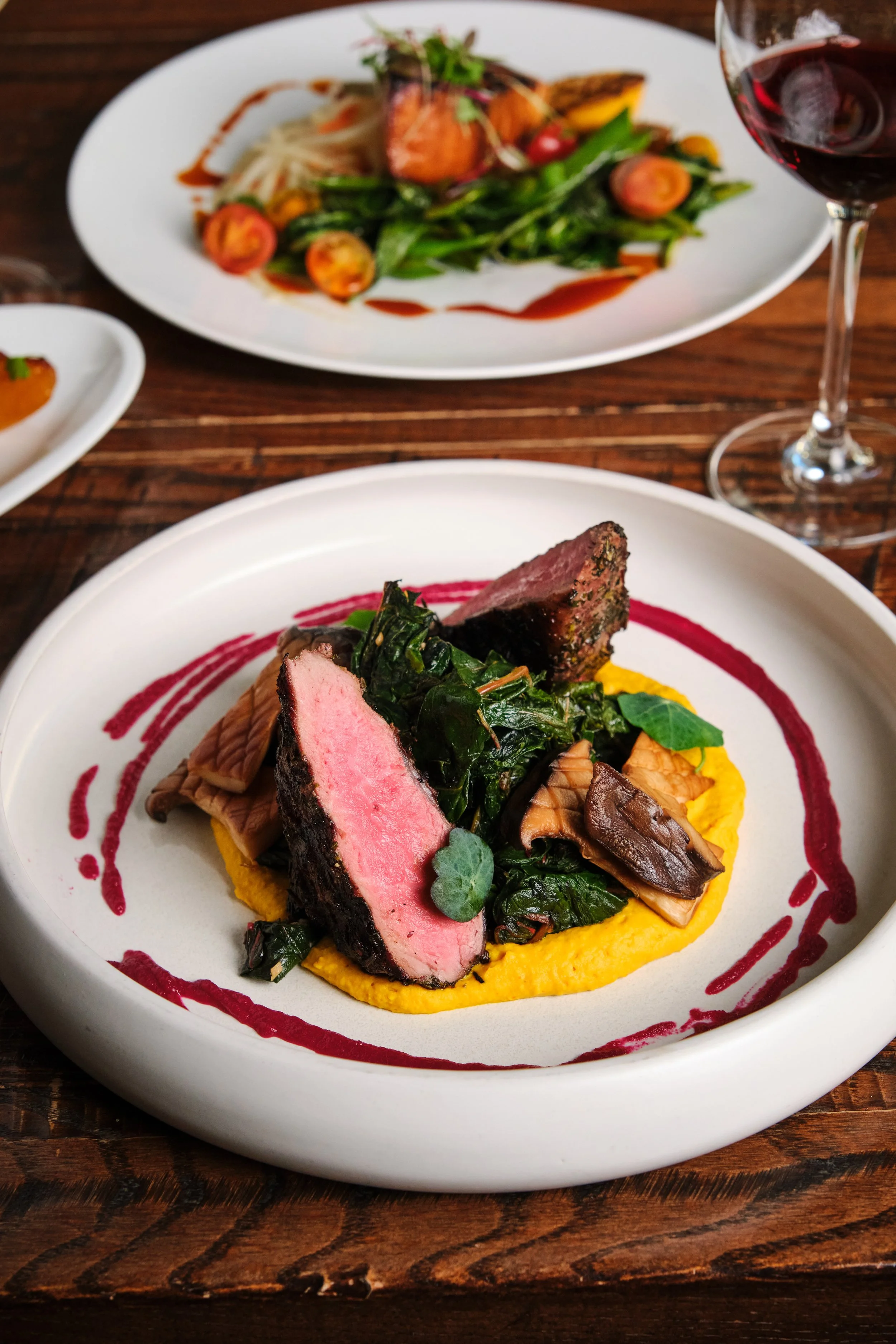 A plated gourmet dish featuring a sliced lamb tenderloin with a pink center, served on a bed of sautéed chard and mushrooms, garnished with herbs, and drizzled with a red sauce; background includes a salad, a glass of red wine, and a wooden table.